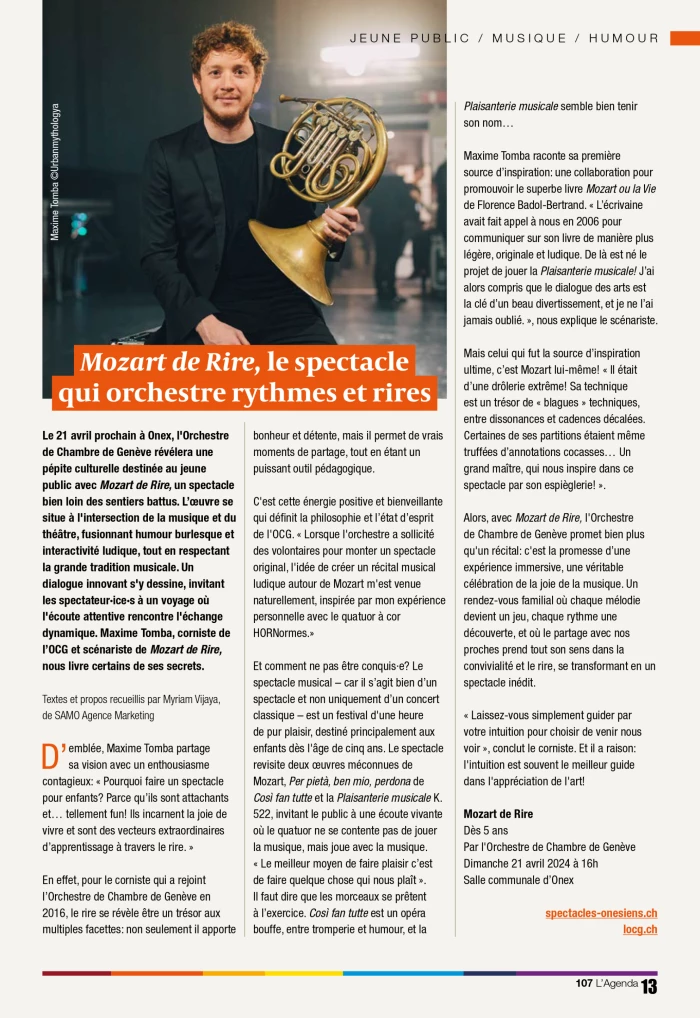 Intéresser un large public à la musique classique et surtout l’audience la plus exigeante qui soit, les enfants, n’est de loin pas une mince affaire. L’Orchestre de Chambre de Genève (OCG) s’est pourtant lancé ce défi, car partager sa passion et la beauté de cet art fait partie de son identité. Pour y parvenir, les musicien·ne·s ont concocté un spectacle musical drôle et ludique, « Mozart de rire », basé sur deux oeuvres de l’un des plus grands compositeurs de musique classique de l’histoire, Mozart.